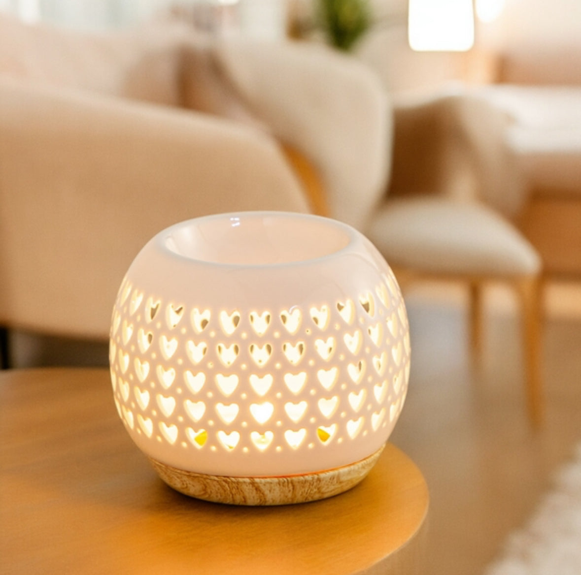 NOUVEAU - Ce brûle-parfum marie l'utile à l'agréable. Avec ses délicats cœurs ajourés, une douce lumière émergera lorsque vous allumerez votre bougie chauffe-plat. Parfait pour une soirée cocooning au chaud sous votre plaid, savourez cet instant de relaxation avec votre parfum préféré.